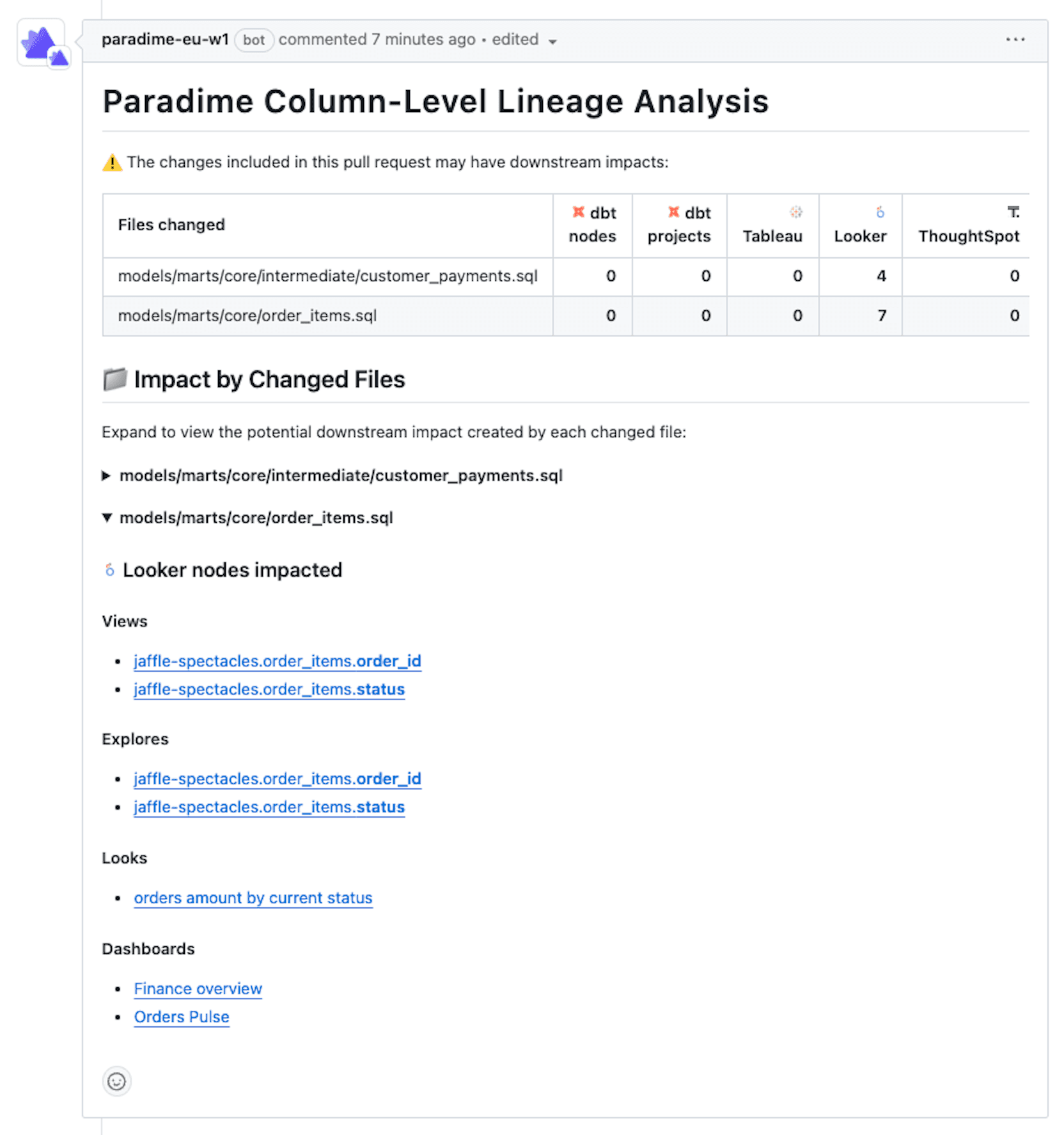 Paradime's Bolt CI/CD framework takes lineage analysis a step further with automated impact detection. When you open a pull request that modifies dbt™️ models, Bolt automatically generates a lineage diff that highlights which Looker assets will be affected by your changes.