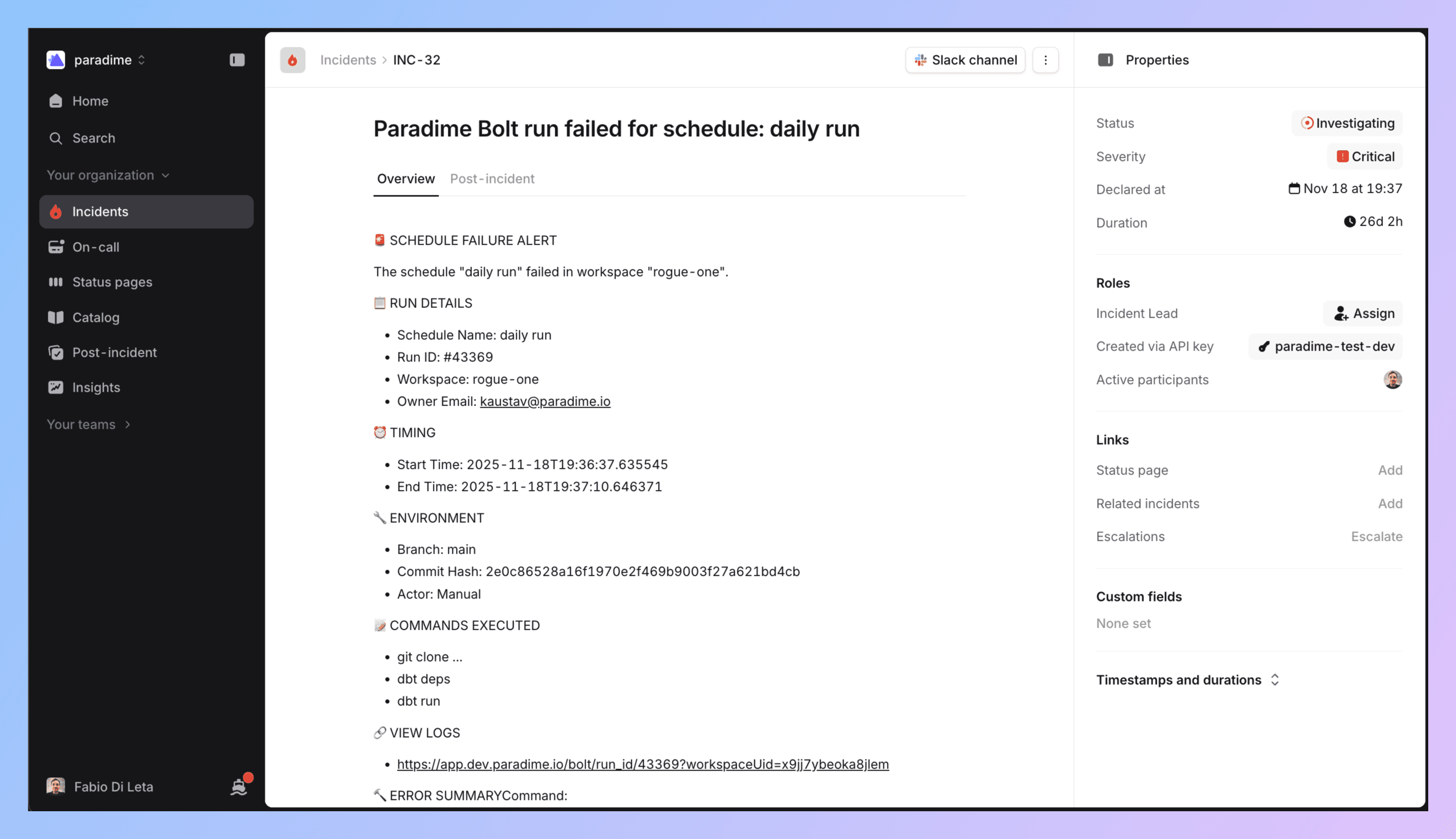 Paradime's Bolt scheduler has trigger integrations. When a run fails, it calls incident.io's API. incident.io creates the incident, routes to on-call, spins up the Slack channel, starts the timeline.