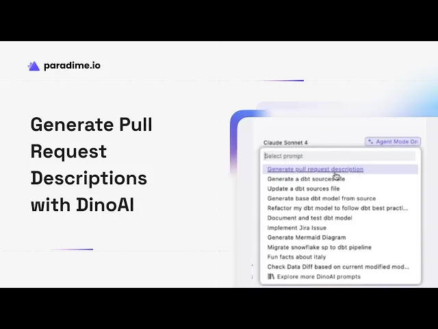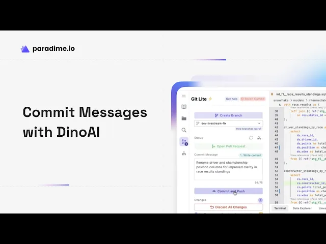 In our latest Paradime livestream, we demonstrated how DinoAI transforms Git from a necessary evil into an intelligent development partner. Unlike traditional Git interfaces that require expertise and create friction, Paradime's AI-enhanced Git workflows eliminate complexity while maintaining the power that data teams need for professional development.