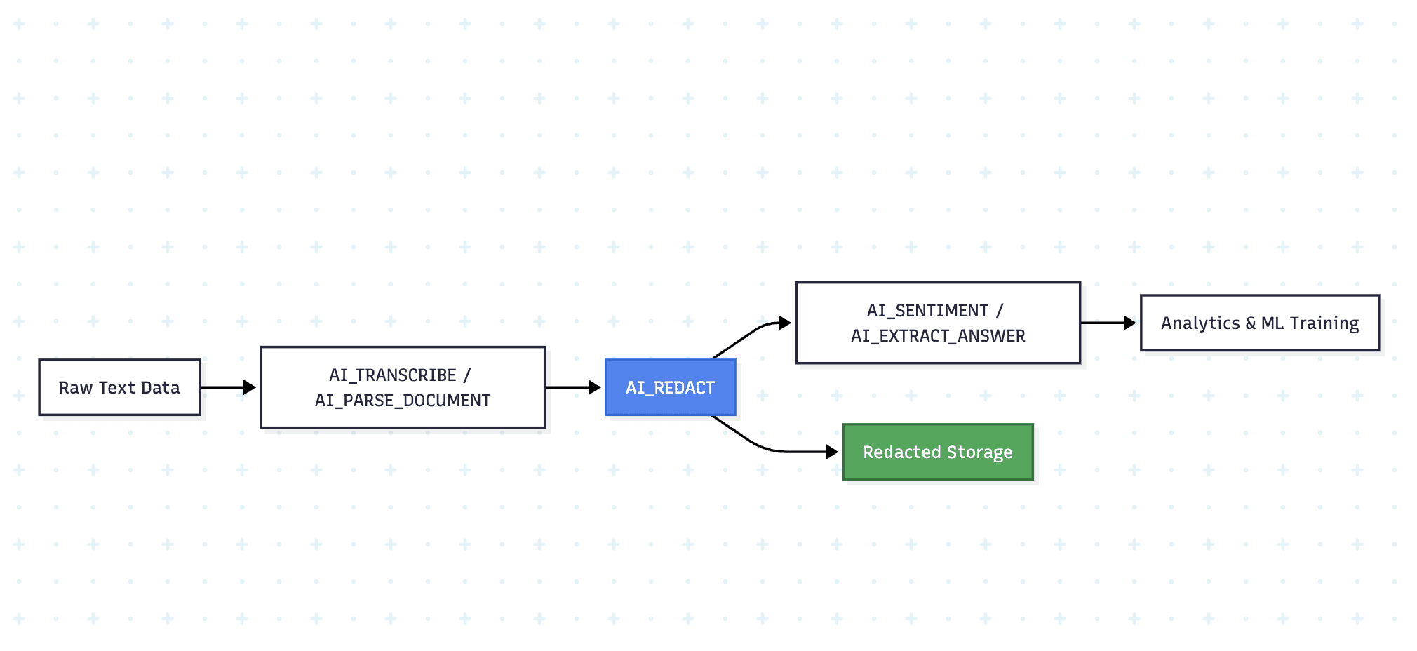 This pattern demonstrates a key advantage of AI_REDACT: seamless integration with Snowflake's AISQL ecosystem. You can chain AI_REDACT with functions like AI_SENTIMENT, AI_PARSE_DOCUMENT, or AI_TRANSCRIBE to build complete privacy-preserving analytics pipelines.