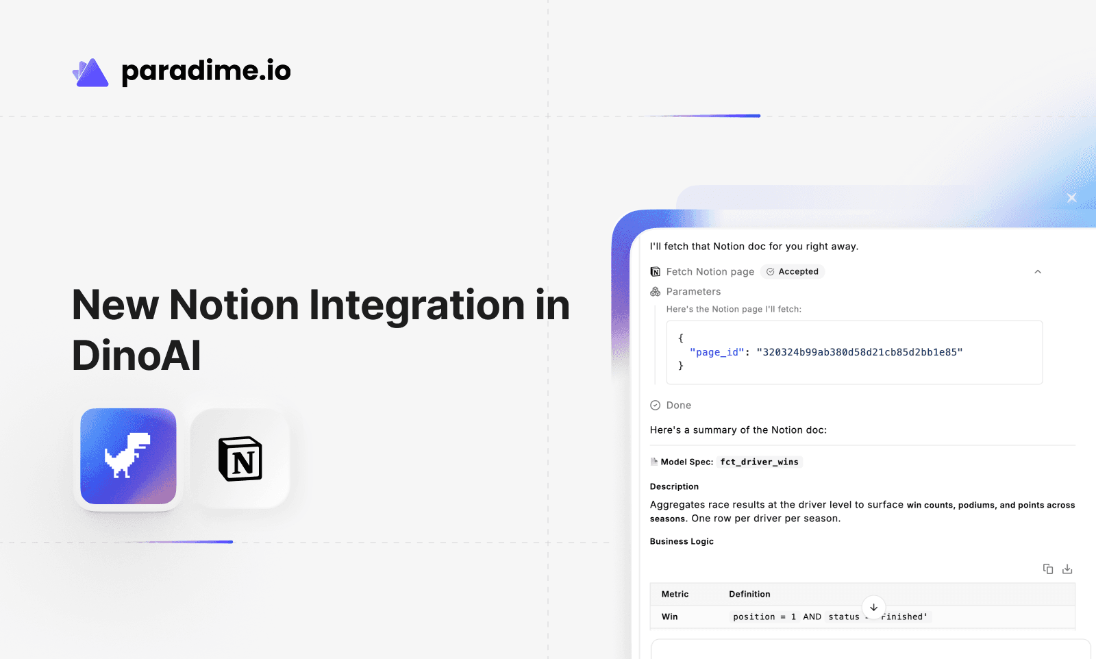 Analytics engineering teams already live in Notion — storing sprint plans, technical specs, data modeling standards, and inline feedback from stakeholders. DinoAI's Notion Tool pulls that knowledge directly into your development workflow: search your workspace, fetch page content, extract comments, and act on them — turning Notion pages into dbt™ models, tests, and documentation without the manual translation step.