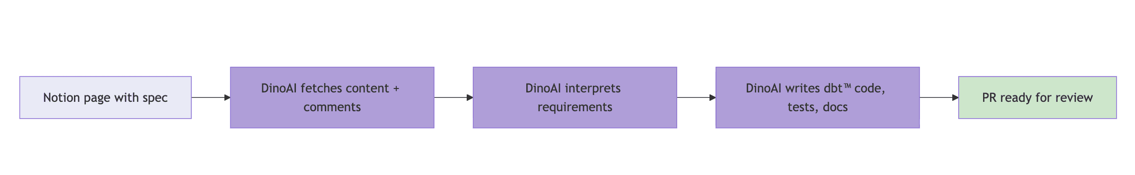 For teams that document everything in Notion before building anything in dbt™, this workflow closes the full loop: search for the right page, fetch its content, and build the implementation — all in one DinoAI prompt.