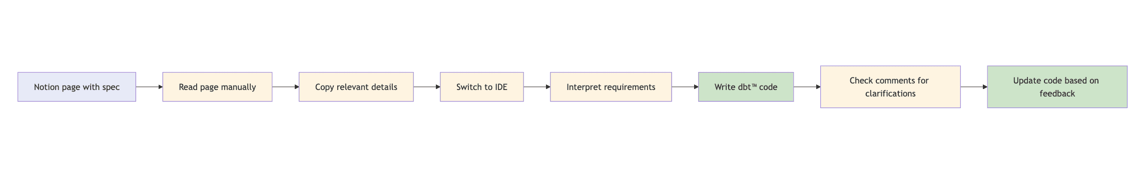 Analytics engineering teams already live in Notion. Sprint plans live in databases, technical specs are documented in pages with toggles and callouts, data modeling standards are maintained in a shared wiki, and stakeholder feedback arrives as inline comments on requirement pages. By the time you sit down to implement the work, you've already done a round of context-gathering — reading the spec, checking the comments, deciding what needs to be built — before a single line of SQL gets written.