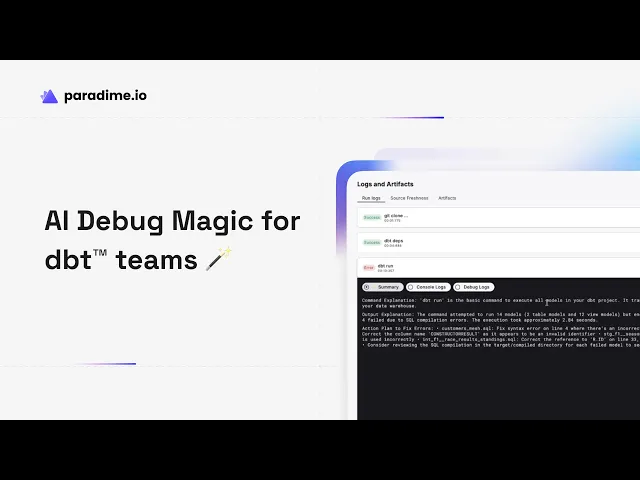 But the real breakthrough comes with Paradime's AI-powered debugging capabilities. Instead of parsing hundreds of lines of console output during incidents, teams get human-readable summaries with specific remediation steps: "There's an invalid column reference in your staging model. Check line 15 where 'customer_id' is referenced—this column doesn't exist in the source table."