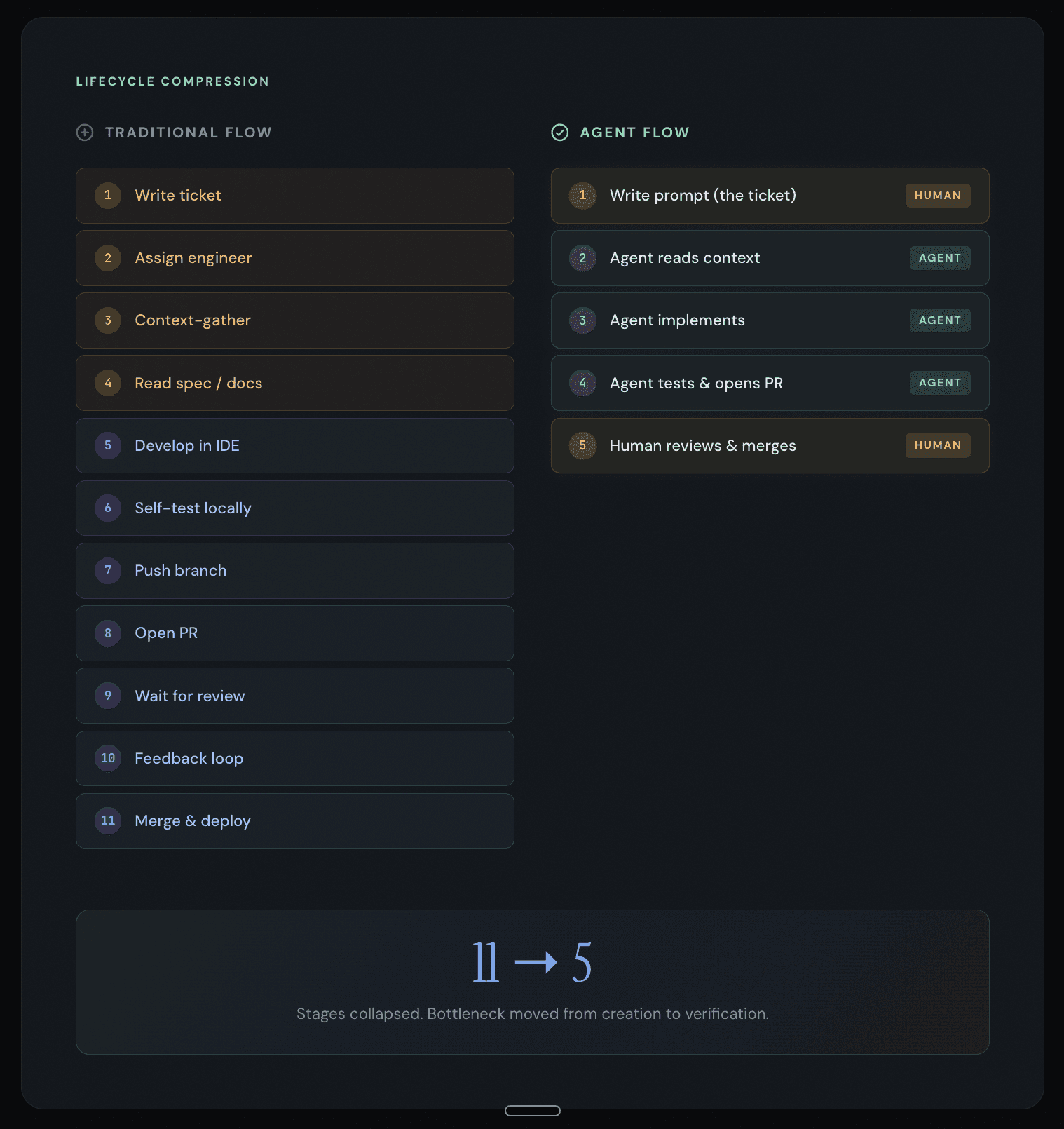 Six stages collapsed. But more importantly, the three most time-consuming stages — context-gathering, development, and self-testing — are now handled by a system that doesn't lose context, doesn't need coffee, and doesn't get pulled into a Slack thread about the office kitchen.