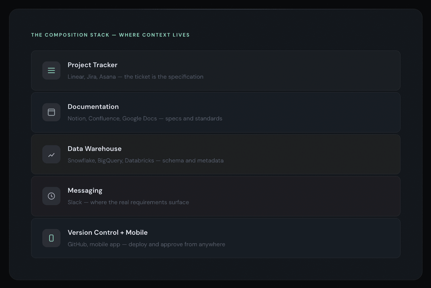 And the composition has to extend beyond the IDE. Analytics engineering doesn't happen in one place. Conversations happen in Slack. Specs live in Notion or Confluence. Tickets live in Linear or Jira. Code lives in GitHub. The warehouse is Snowflake or BigQuery or Databricks. A truly autonomous agent operates across all of these surfaces, because that's where the context lives.