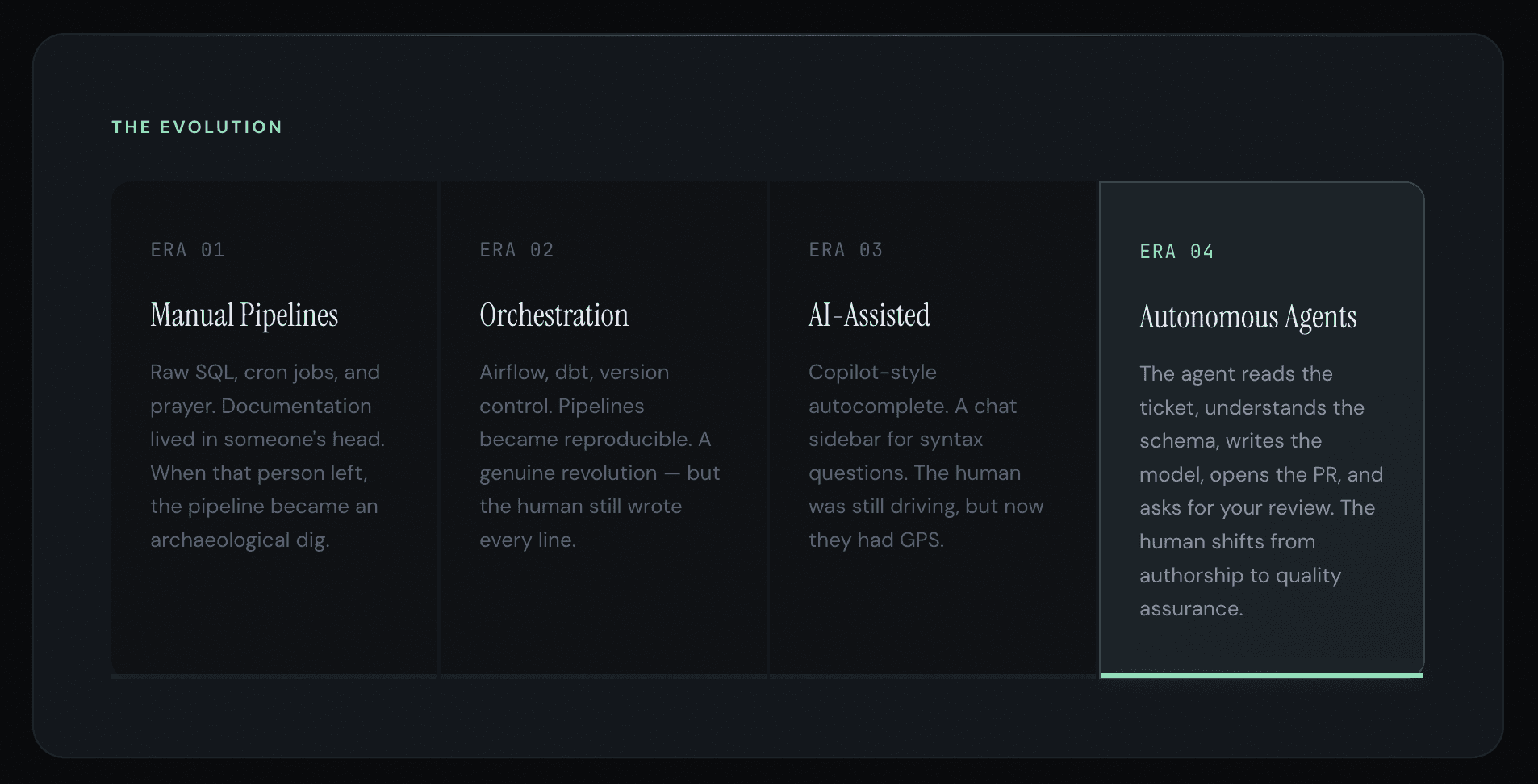 We're in the early-adopter window for autonomous data agents right now. The teams that learn to work with agents — that develop the muscle memory for writing good specifications, that build the guardrails and standards that make agents reliable, that restructure their workflows around human-as-reviewer instead of human-as-author — those teams will compound their advantage every quarter.