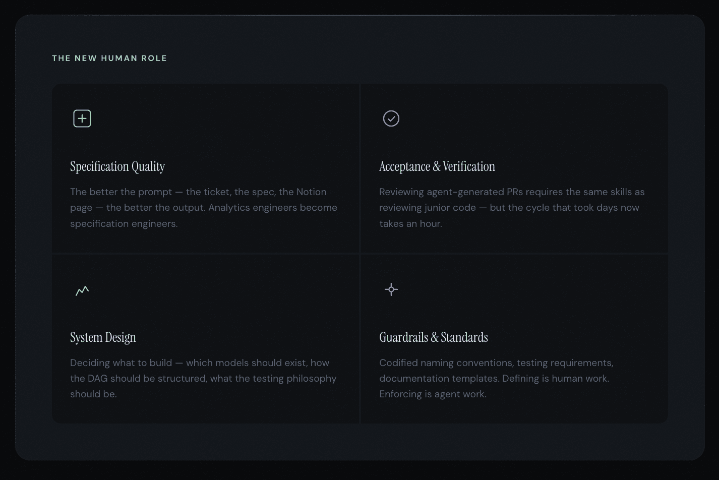 There's a mental model that every analytics engineering team carries around, even if they've never drawn it on a whiteboard. It goes like this: someone writes a ticket. Someone else picks it up. They read the spec, open the IDE, write the SQL, test it locally, push a branch, open a PR, wait for review, get feedback, iterate, merge, deploy, monitor. Each stage has its own tool, its own context switch, its own latency. The whole thing takes days. Sometimes weeks. And everyone involved treats it as normal — the way things have always been done.