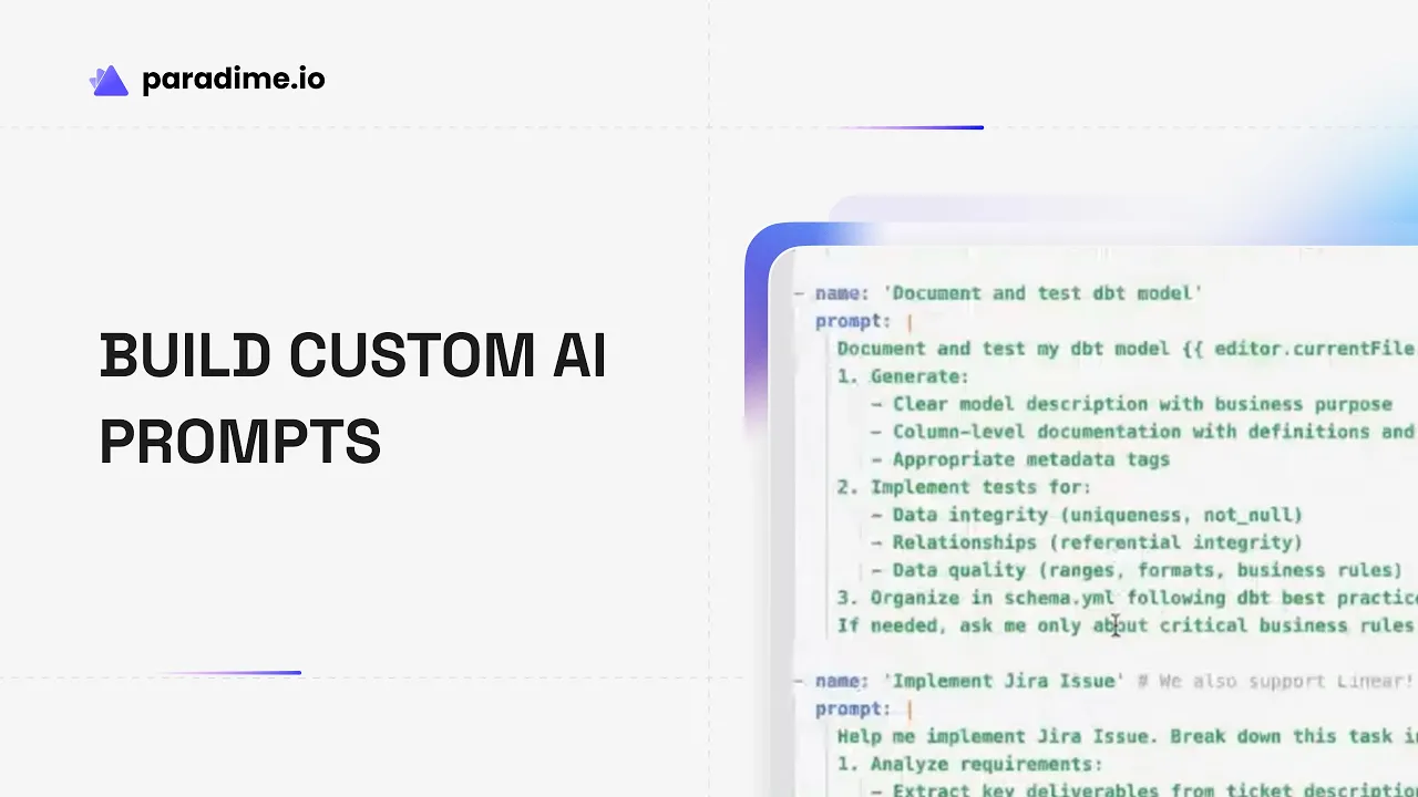 What makes .dinoprompts different is its deep integration with the Paradime Code IDE and git-tracked collaboration model. Your prompts aren't stored in some external tool or personal notes file—they're version-controlled alongside your code, making them searchable, shareable, and sustainable.