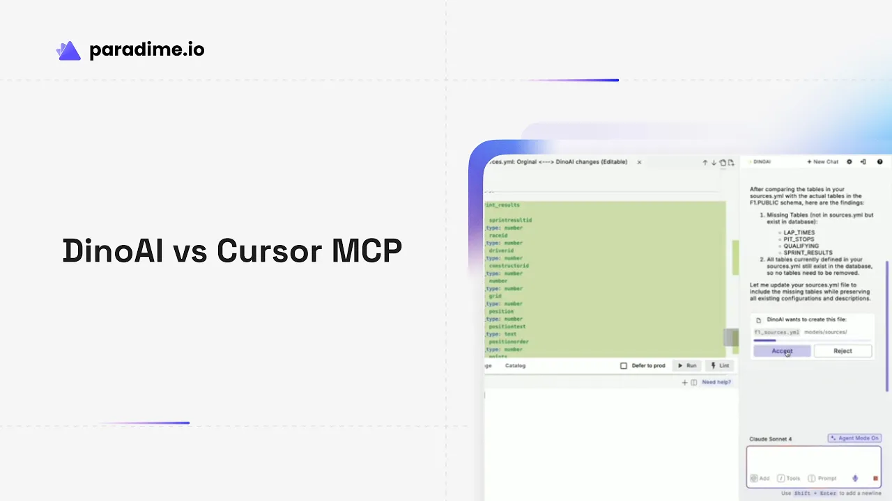DinoAI has native access to both your warehouse schema and repository structure. Cursor MCP accesses the same information through an intermediary layer that requires explicit configuration.