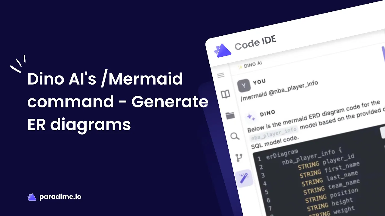 DinoAI is Paradime's integrated AI co-pilot, built directly into the Code IDE to accelerate analytics engineering workflows. The /Mermaid command represents a breakthrough in documentation automation: simply describe the ERD you need in natural language, and DinoAI generates complete, accurate Mermaid.js code that visualizes your database structure.