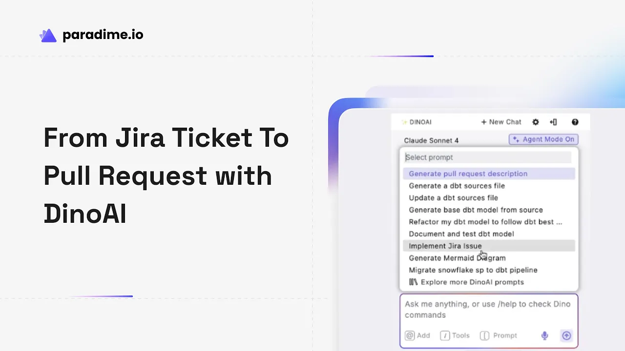 Automated ticket-based development represents a paradigm shift in analytics engineering, moving teams from manual, repetitive coding to intelligent, context-aware automation. Paradime's integration of Jira with DinoAI demonstrates how context engineering transforms product requirements into production-ready dbt models with minimal human intervention.
