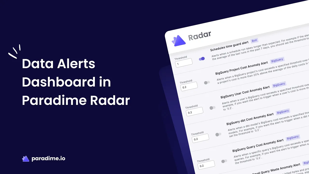 Paradime Radar's real-time alerting capabilities provide data teams with proactive monitoring needed to maintain healthy, cost-efficient data pipelines. By implementing comprehensive alerts across Snowflake and BigQuery for cost anomalies, performance degradation, and resource waste, teams can catch issues within seconds rather than hours or days.