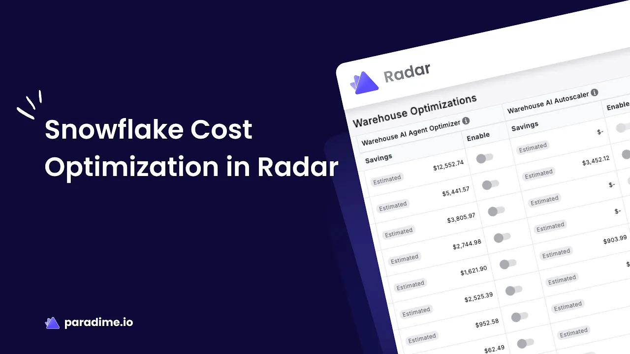 Enter Paradime Radar: an AI-powered cost management suite designed to automatically optimize Snowflake warehouse spending without compromising on performance. In this guide, we'll explore how Radar's three core optimization features—the Warehouse AI Autoscaler, Warehouse AI Agent Optimizer, and Idle Time Optimizer—can help your team achieve 8-18% reductions in annual Snowflake bills.